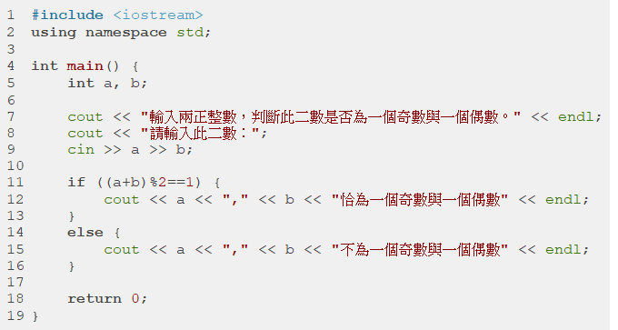 輸入兩正整數,判斷此二數是否為一個奇數與一個偶數。 請輸入此二數:55 56 55,56恰為一個奇數與一個偶數