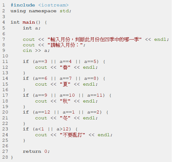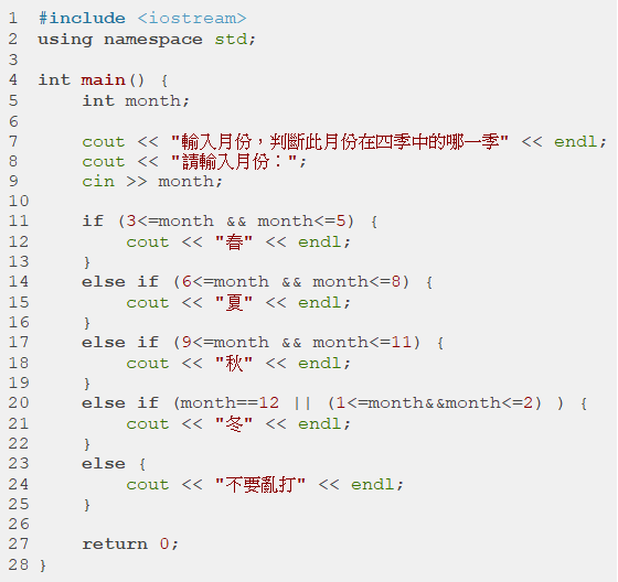 輸入月份,判斷此月份在四季中的哪一季 請輸入月份:8 夏
