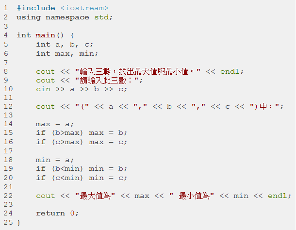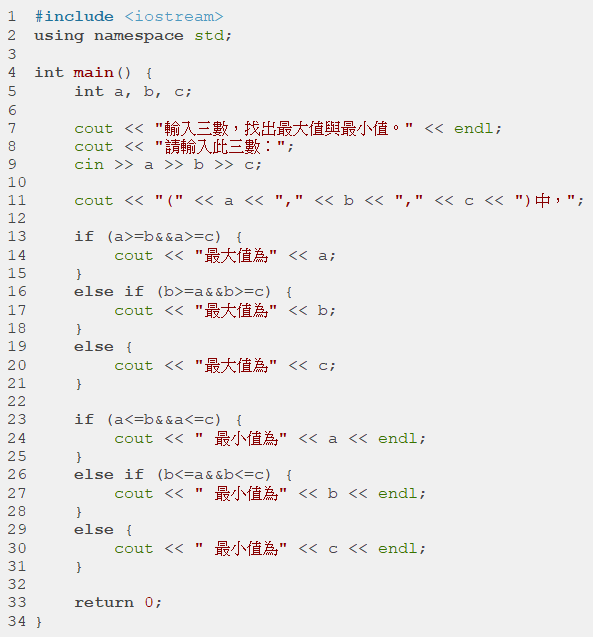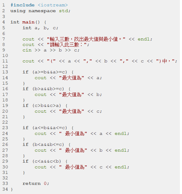 輸入三數,找出最大值與最小值。 請輸入此三數:3 4 5 (3,4,5)中,最大值為5 最小值為3