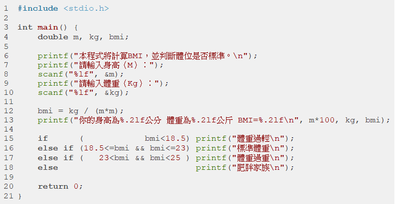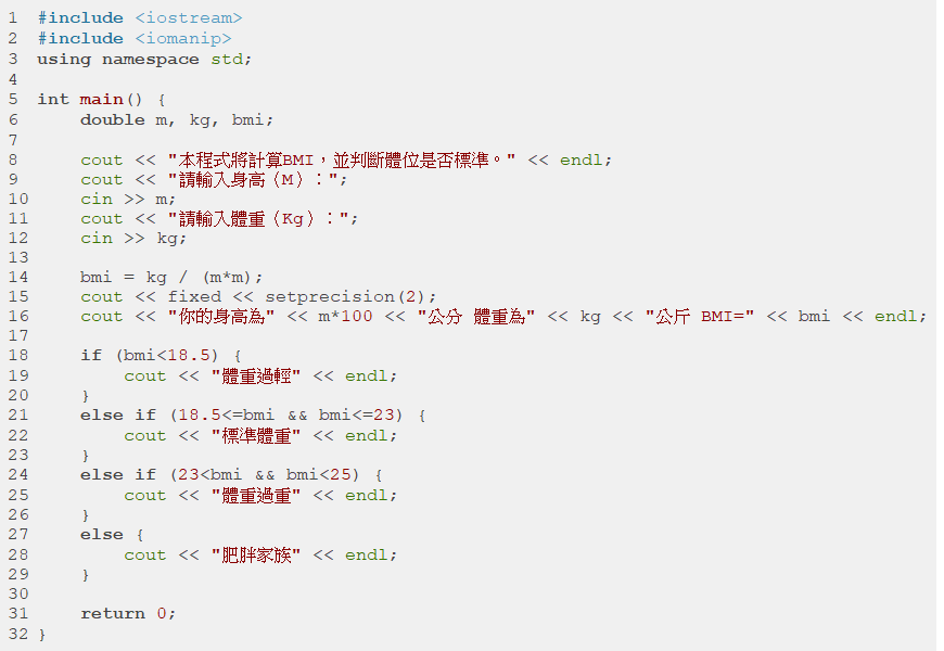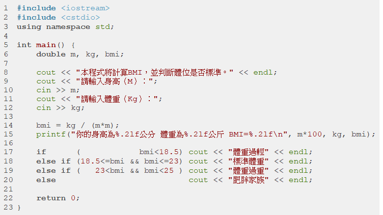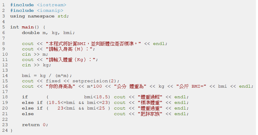 本程式將計算BMI,並判斷體位是否標準。 請輸入身高(M):1.75 請輸入體重(Kg):70 你的身高為175.00公分 體重為70.00公斤 BMI=22.86 標準體重