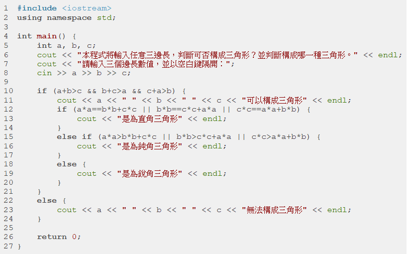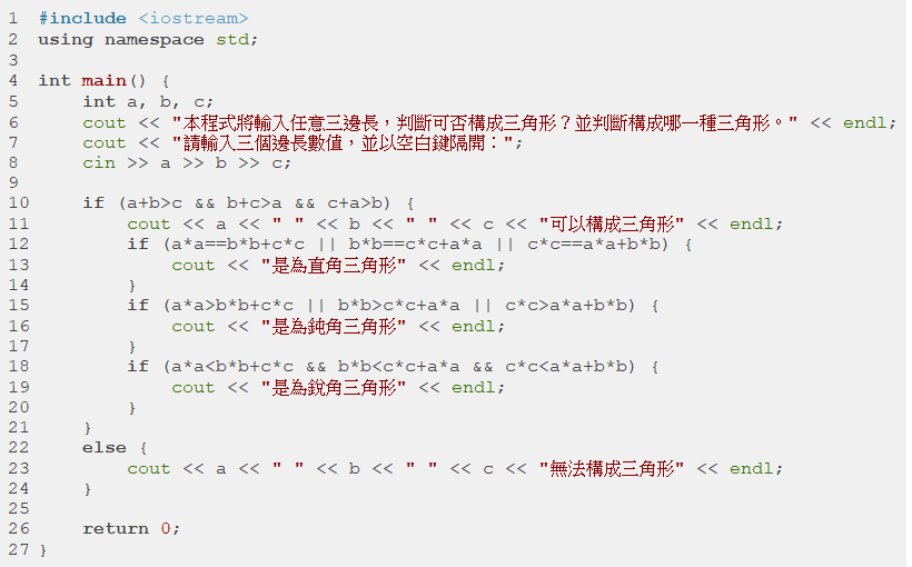 輸入任意三邊長,判斷這三邊長可否構成三角形?並判斷構成哪一種三角形。